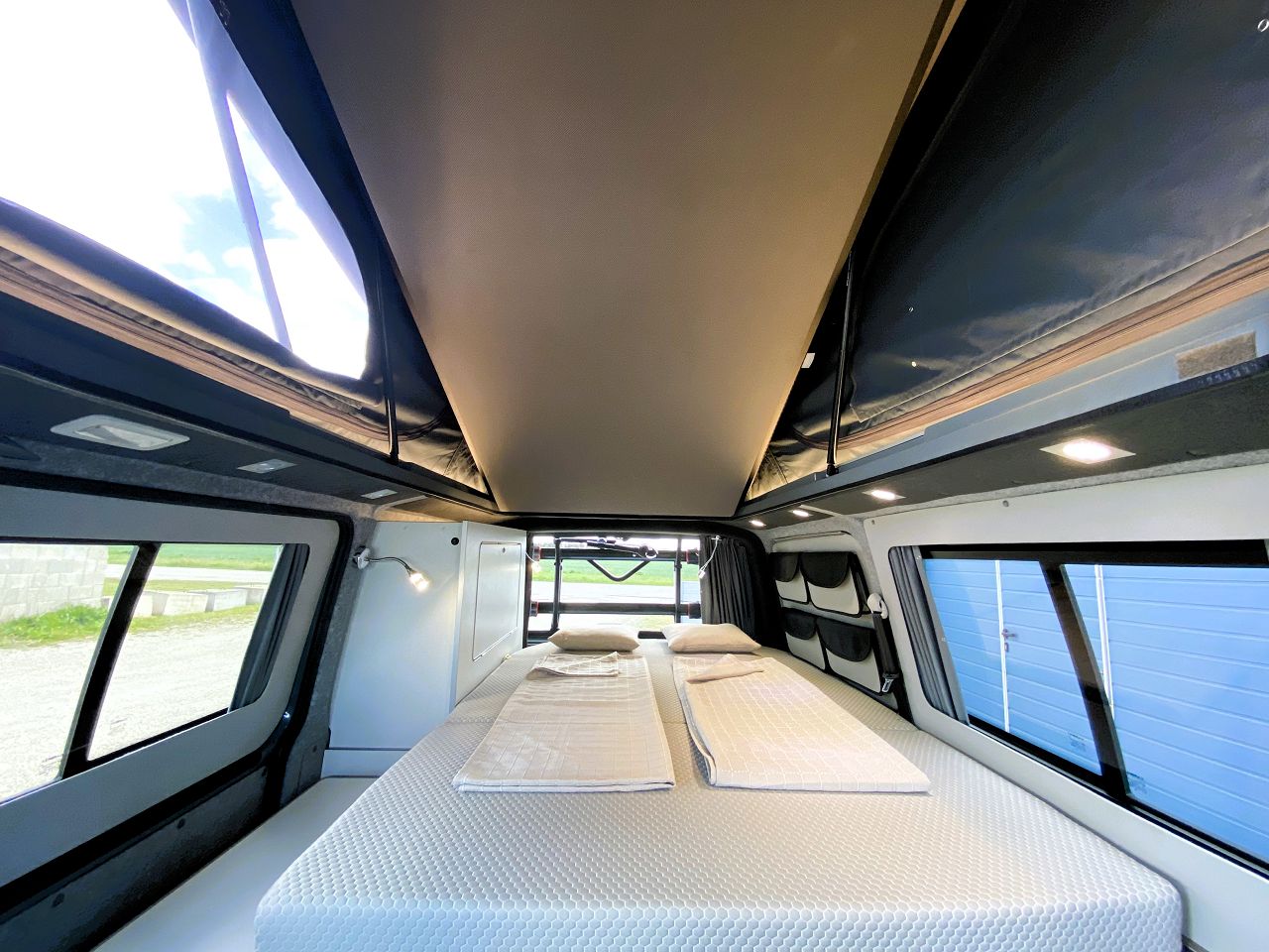 DACHBETT - beim SCA 290 schläfst Du auf knapp 200 x 130cm auch in heißen Nächten superluftig! Die Tellerfederung sorgt für hohen Schlafkomfort. Der Aufstieg erfolgt über die gedrehten Fahrerhaussitze.