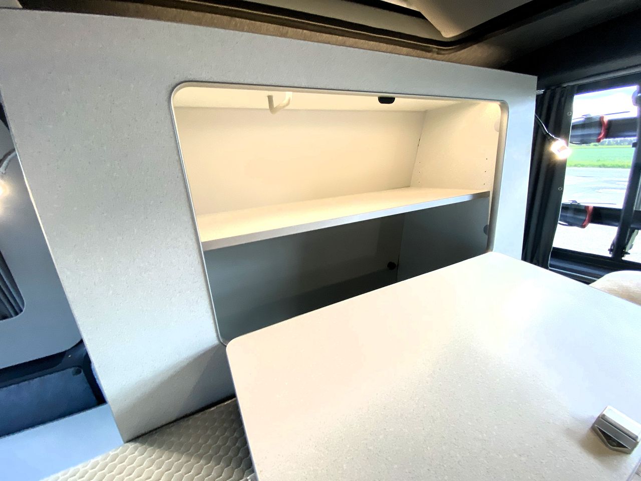 Heckschrank- 2 Fächer - paßt in den VW Bus ohne zusätzlichen Wärmetauscher - also in jeden Transporter und Kombi ohne Zuheizer Fahrgastraum. Mit Beleuchtung und großen Klappen läßt er sich leicht be- und entladen. Läßt Du den Schrank weg ist Platz für ein Bike.