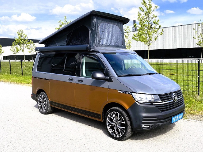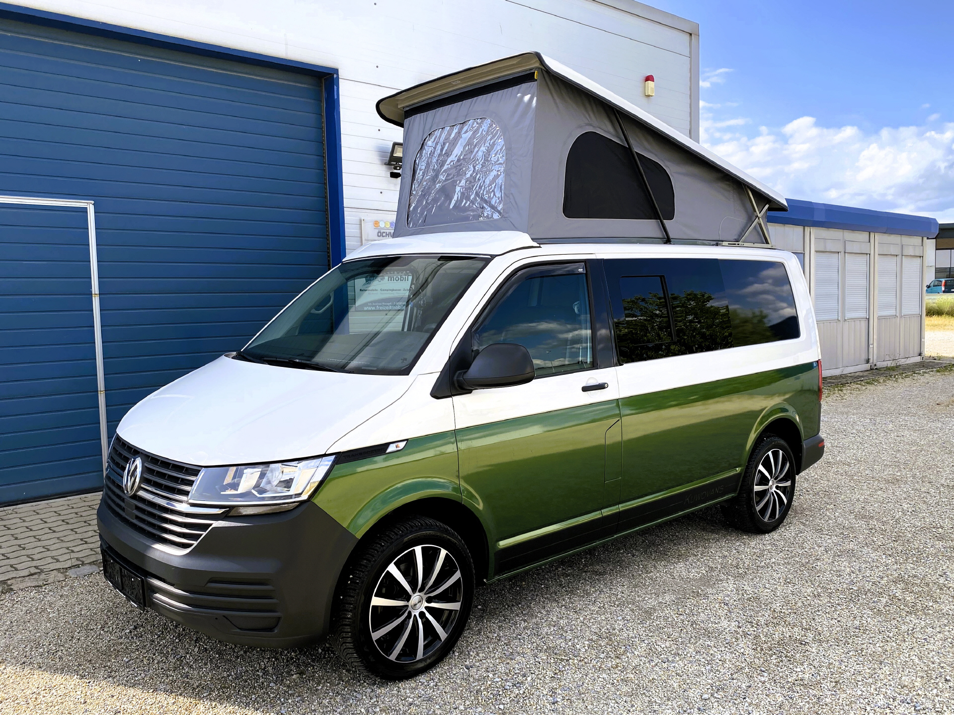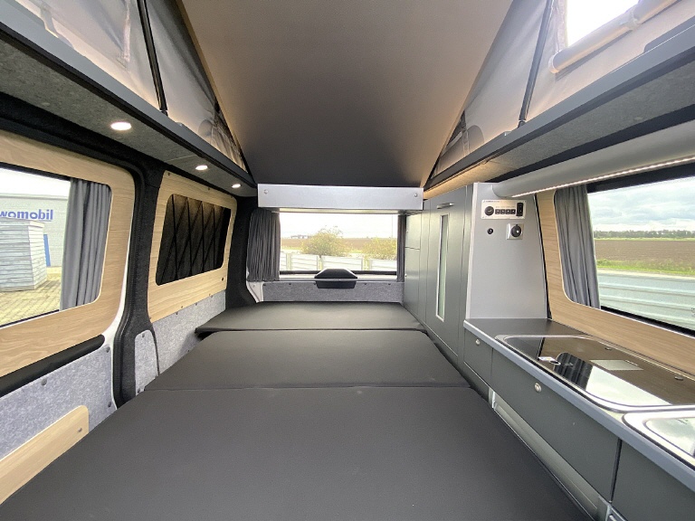 REIMO TRIOSTYLE - KUWOVANS BUS.2 Diese Variante ist vergleichbar mit dem VW California Ocean. Eine Möbelzeile mit Küche, Wasseranlage, Gasanlage, 12V und 230V Module, variable Schlafsitzbank mit 3 Sitzplätzen und 2 Schlafplätzen und ein Schlafdach - hier das Reimo EasyFit vorne hoch Zeltbalg standard -