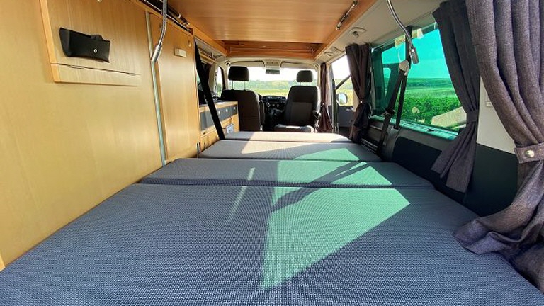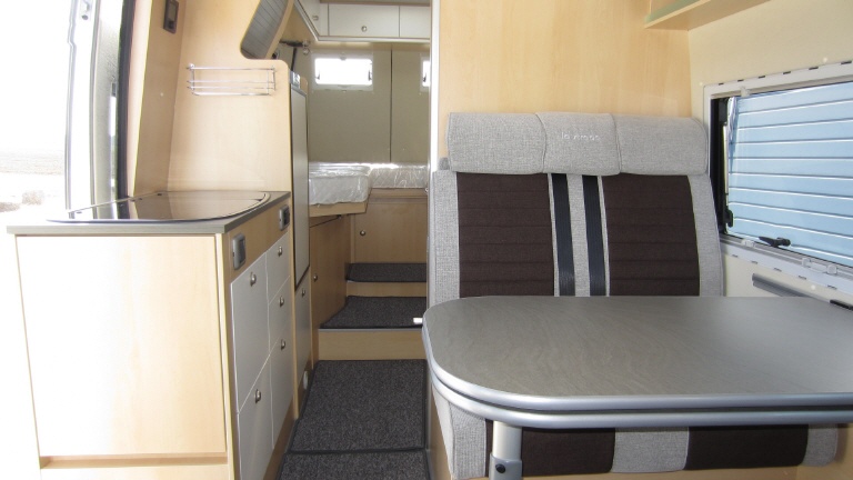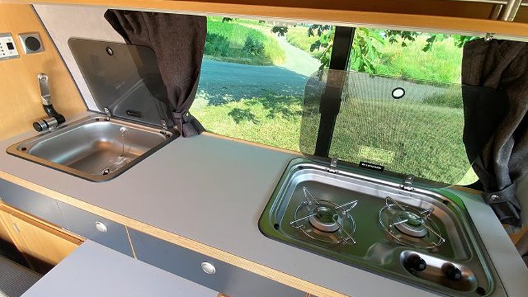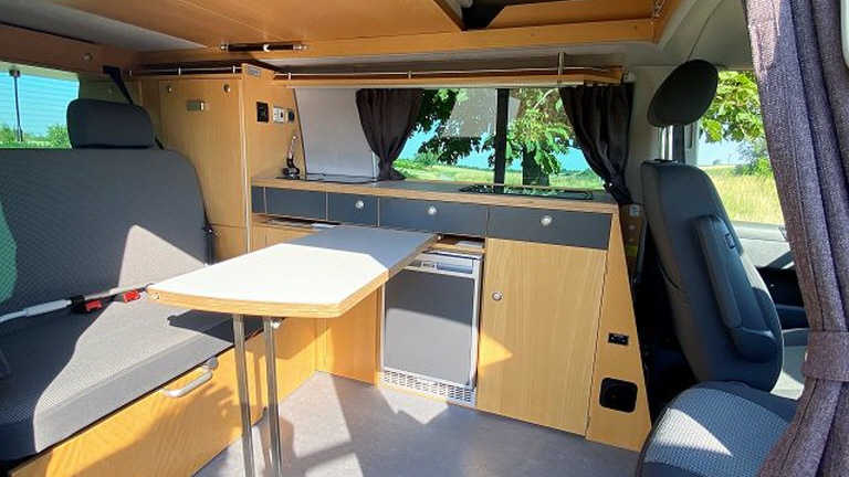 Und er ist ein echter Campingbus. 4 Schlafplätze, 5 Sitzplätze, 12V und 230V Stromversorgung, Kühlbox und Gaskocher, Diesel Wohnraum- und Standheizung, viel Stauraum rundum und Platz für alle am großen Tisch.