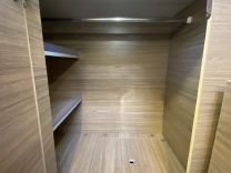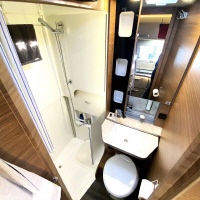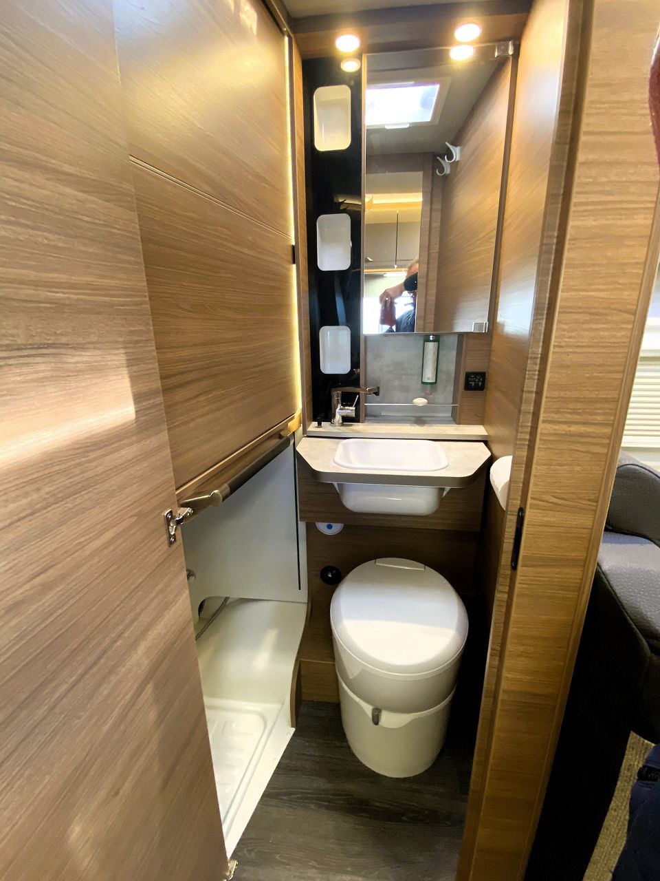Xpand Bad mit Dusche, klappbaren Duschwänden, verschiebbares Waschbecken, THETFFORD Toilette mit Kassette 19L drehbar, Dachluke 28x28cm für gute Belüftung.