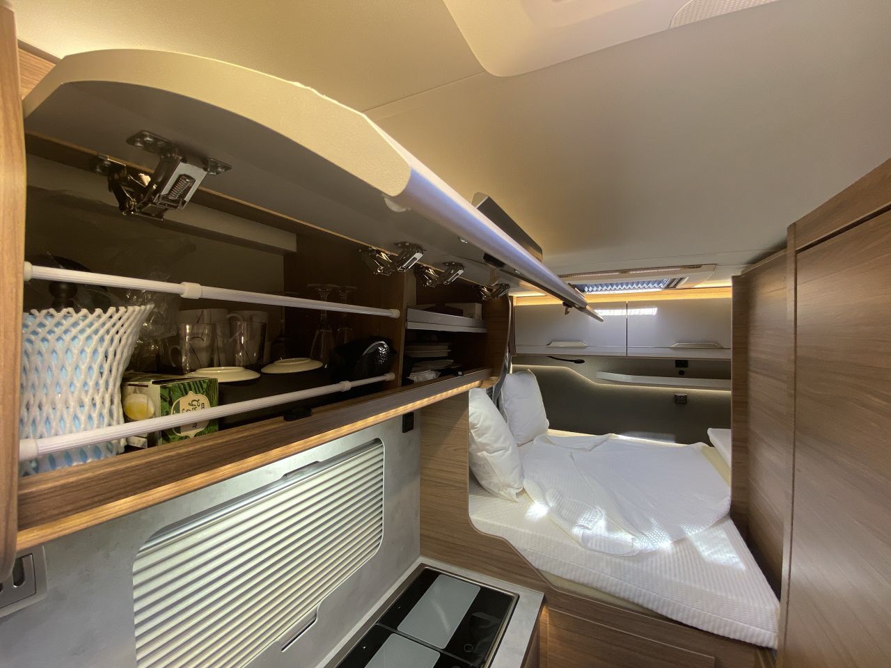 Fixbett im Heck beheizt mit Liegefläche 200 x 135cm. Unterlüftung/Lattenrost, gute Belüftung durch 2 Ausstellfenster und 1 40x40cm Dachluke - Leselampen und indirektes Ambientelicht